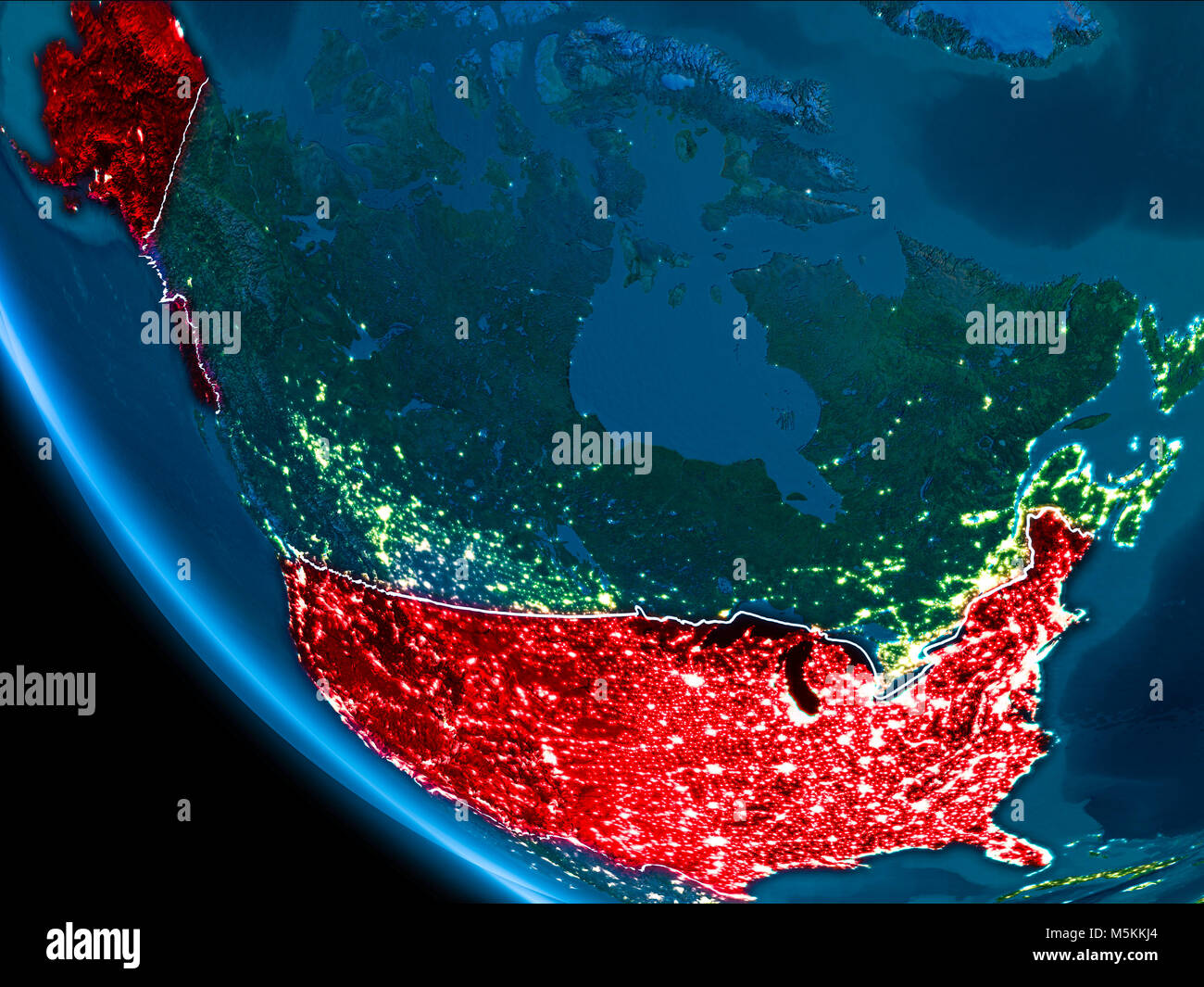 Map Of Usa In Red As Seen From Space On Planet Earth At Night With