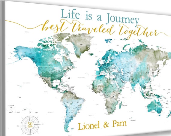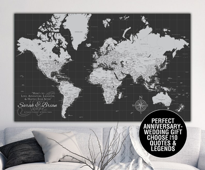 . A personalized push pin world travel map that includes 100 maps pins so you can track your travels. Printed on 100 cotton canvas they make great 2nd anniversary gifts however a personalized world map is a great gift for any occasion. Map color choice. These maps are a great gift for any world traveler.