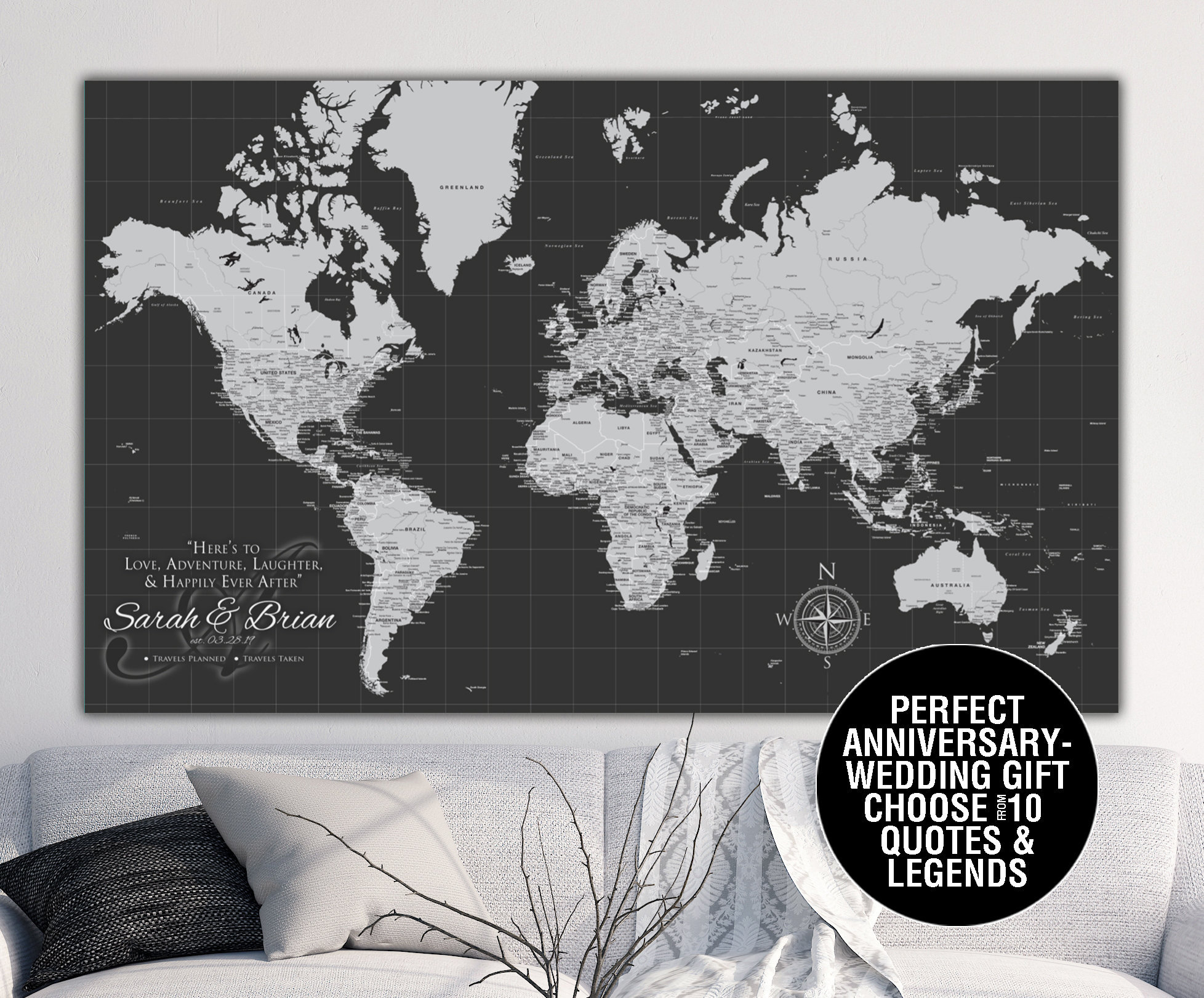A push pin world map is a gift that keeps on giving. This beautiful world push pin map includes complimentary personalization with the names of the couple and their anniversary date is offered with a choice of a vintage or modern world map professionally printed on archival quality paper or cotton blend canvas available in three standard sizes and includes 100 map pins for pinning your travels. They also make great gifts for wedding anniversaries. Personalized anniversary pushpin world map 149 00 338 personalized family travel pushpin world map 175 00 4 custom map cut prep board 50 00 70 00 75 anniversary map candle 45 00 11 100 movies scratch off poster 15 00 255 reviews.
