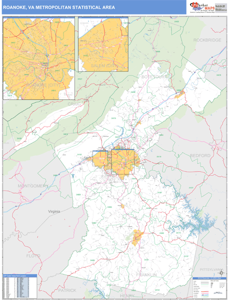 Roanoke Va Metro Area Zip Code Wall Map Basic Style By Marketmaps