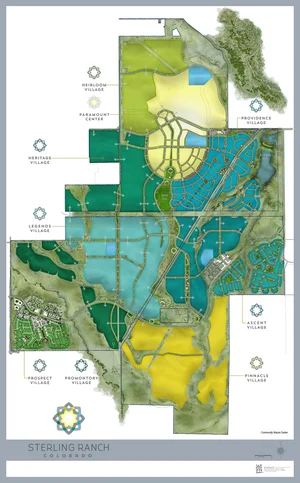 At build out sterling ranch will be home to more than 12 000 new residences spaciously sweeping across nine unique villages all radiating outward from an amenity rich town center and grand civic gathering place. For reference purposes titan road is the straight left to right east to west road with the roundabout near the civic center on the top of each map. Each of our nine villages will boast its own unique character and amenity list. This remarkable community of new homes is positioned in an idyllic valley at the gateway to the front range nestled between two state parks three regional parks and a national forest.