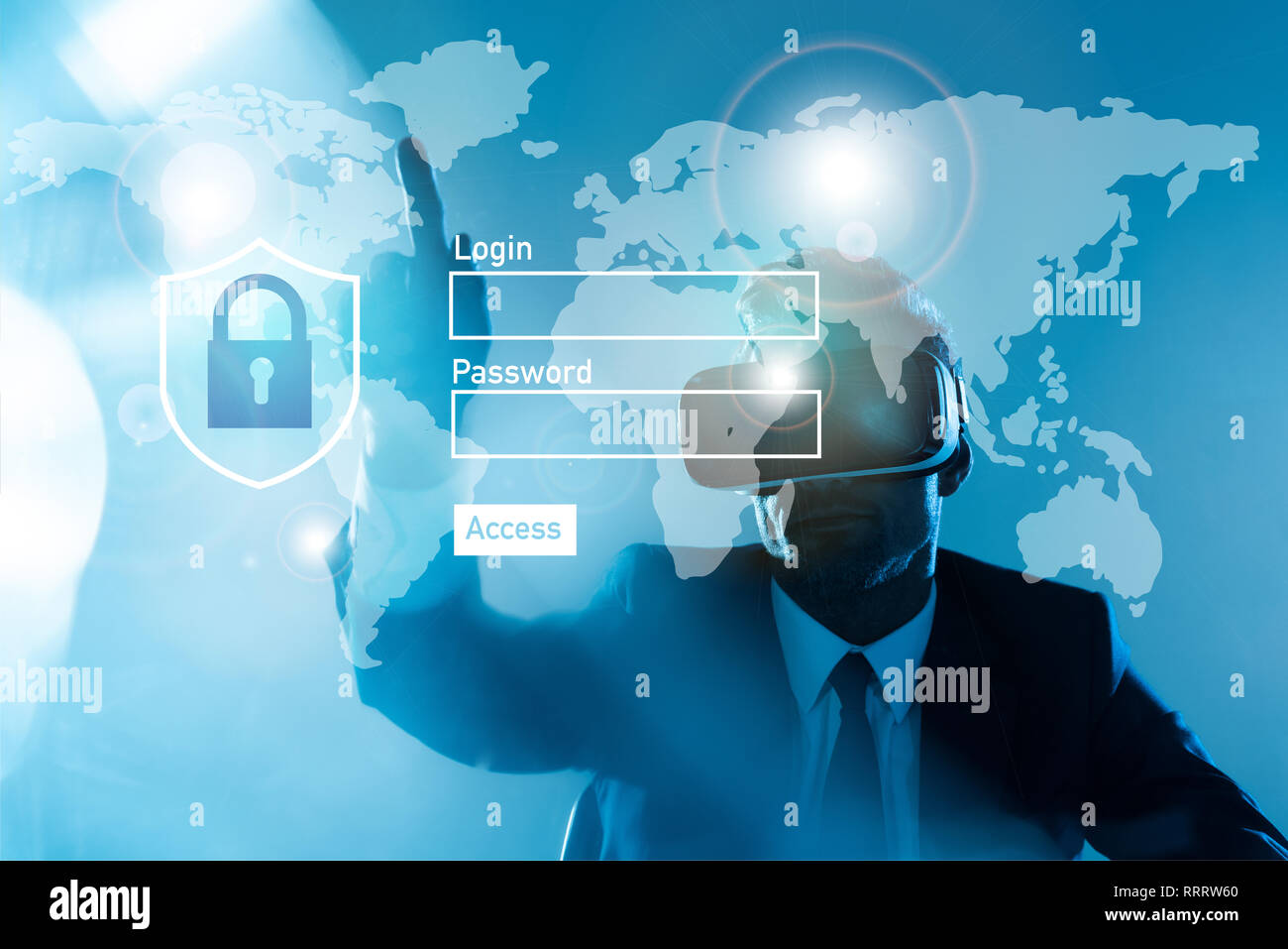 Businessman In Virtual Reality Headset Pointing On World Map And