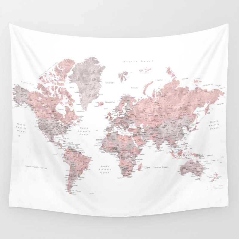 Dusty Pink And Grey Detailed Watercolor World Map Wall Tapestry By